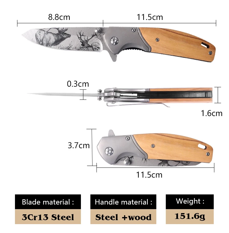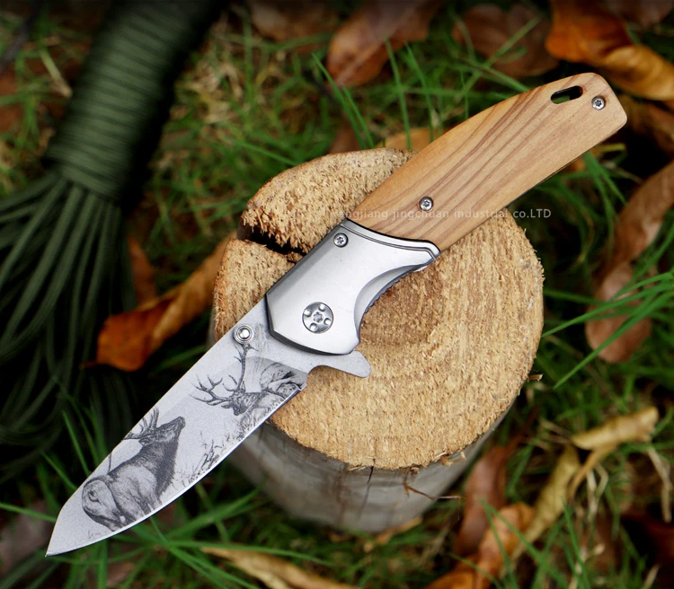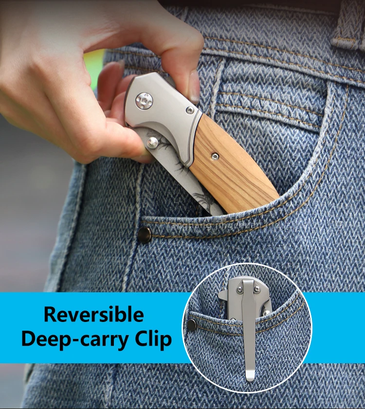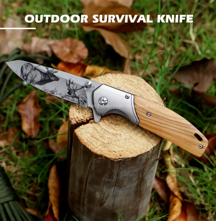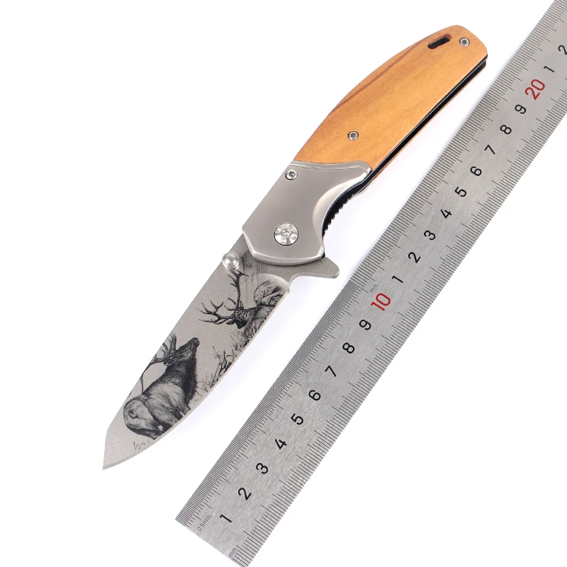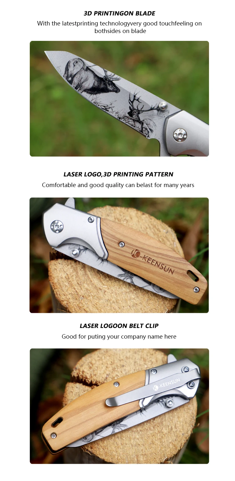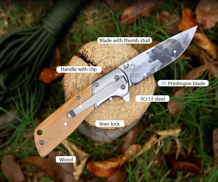 Customize logo Pattern Foldable Wooden Pocket with Clip Camping Knife for Survival