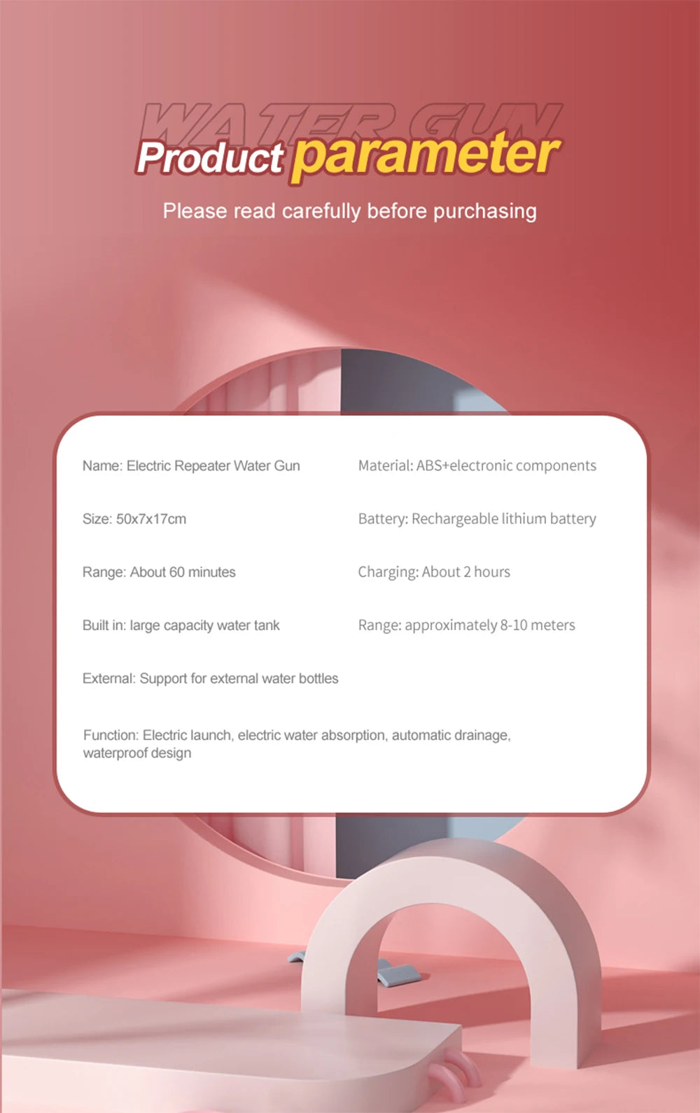 3.After using the product, please drain all the water from the water gun. Otherwise, the water inside the gun may corrode the product, causing functional abnormalities.