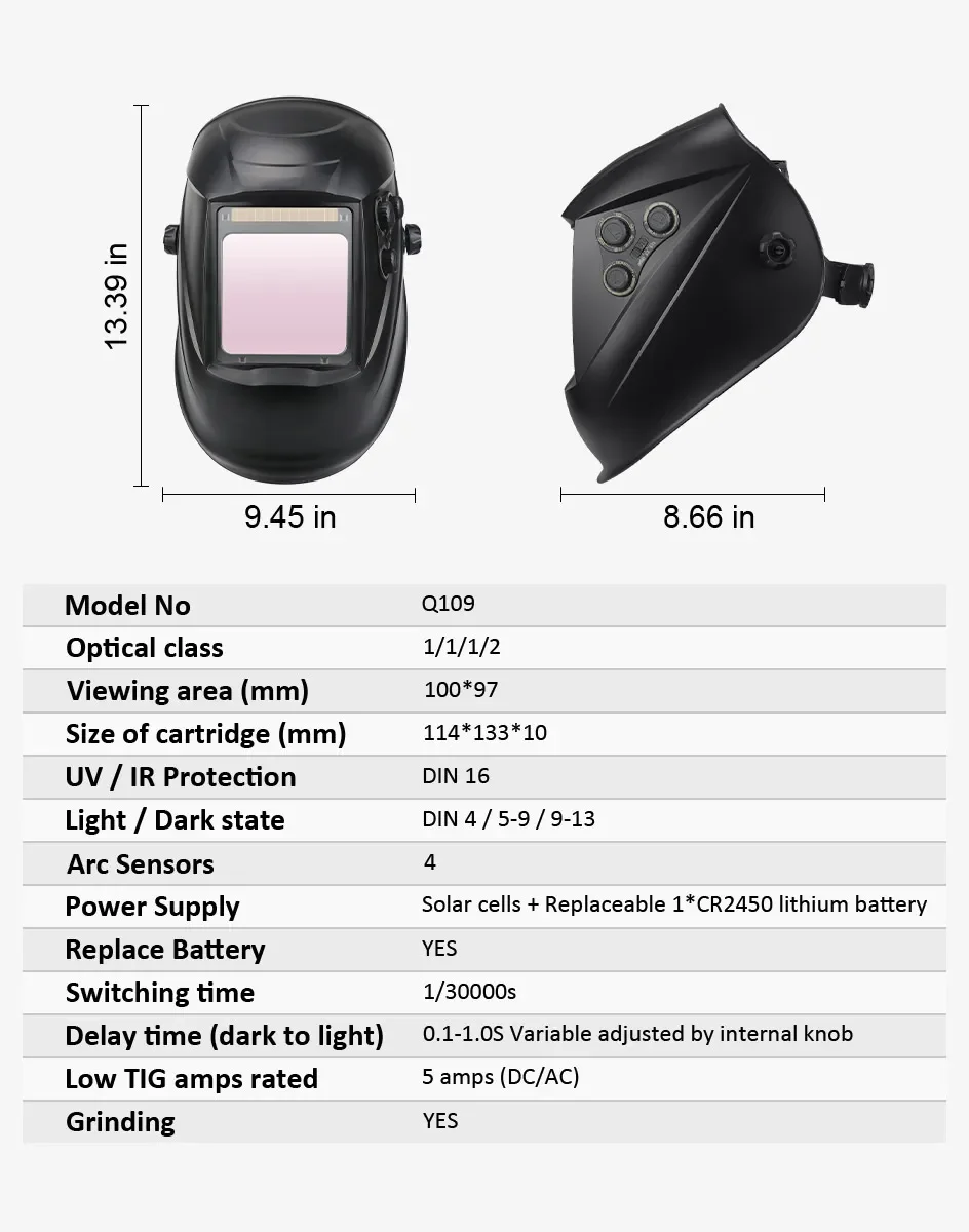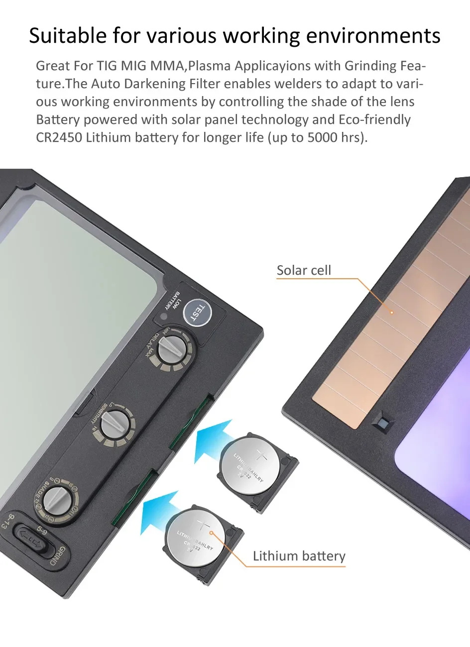Great For TIG MIG MMA,Plasma Applicayions with Grinding Fea-ture.The Auto Darkening Filter enables welders to adapt to vari-ous working environments by controlling the shade of the lensBattery powered with solar panel technology and Eco-friendlyCR2450 Lithium battery for longer life (up to 5000 hrs).