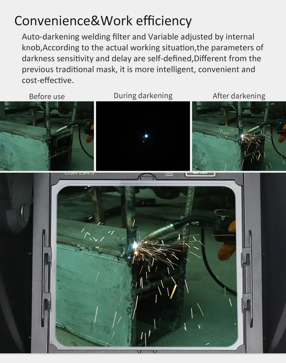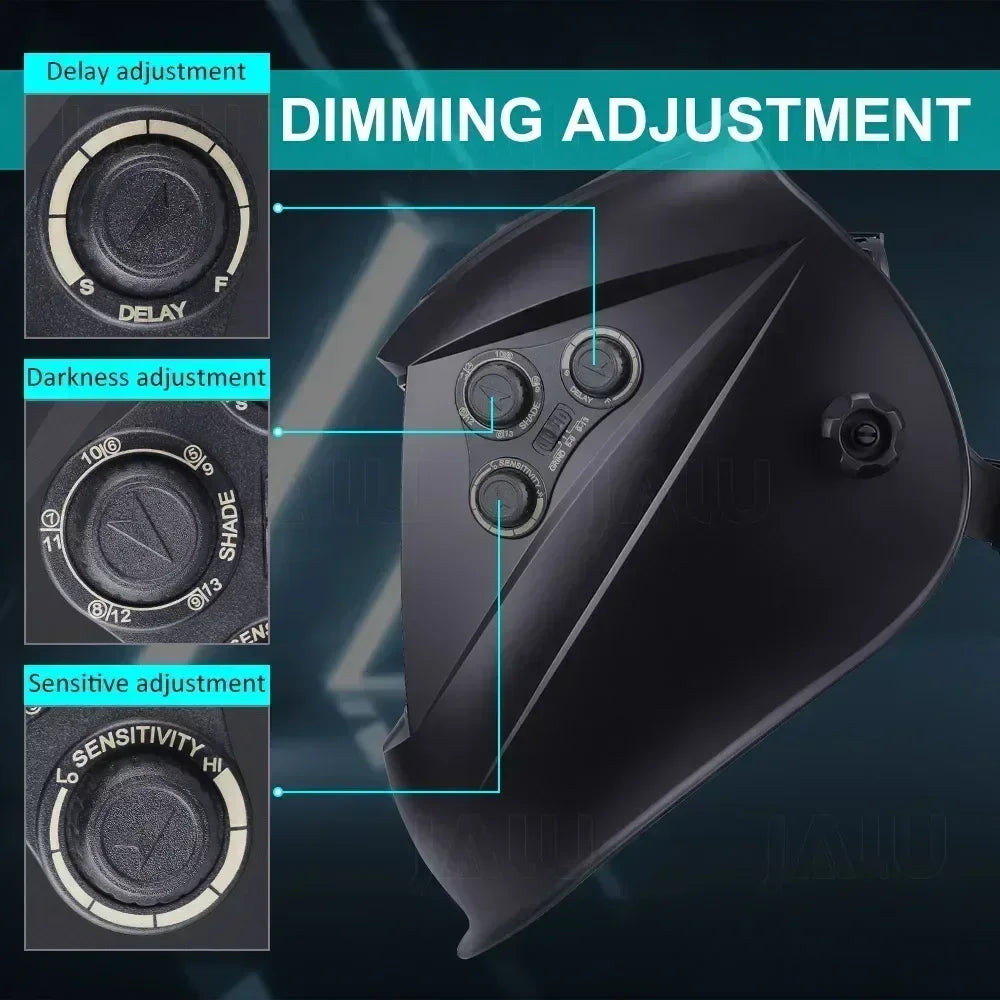 Auto-darkening welding filter and Variable adjusted by internal knob, According to the actual working situation, the parameters of darkness sensitivity and delay are self-defined, Different from the previous traditional mask, it is more intelligent, convenient and cost-effective.