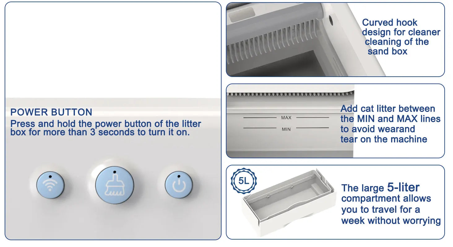 Product Usage: Used for pet cats in household cat toilets, intelligent automatic defecation, supporting WIFI connection and remote control through APP