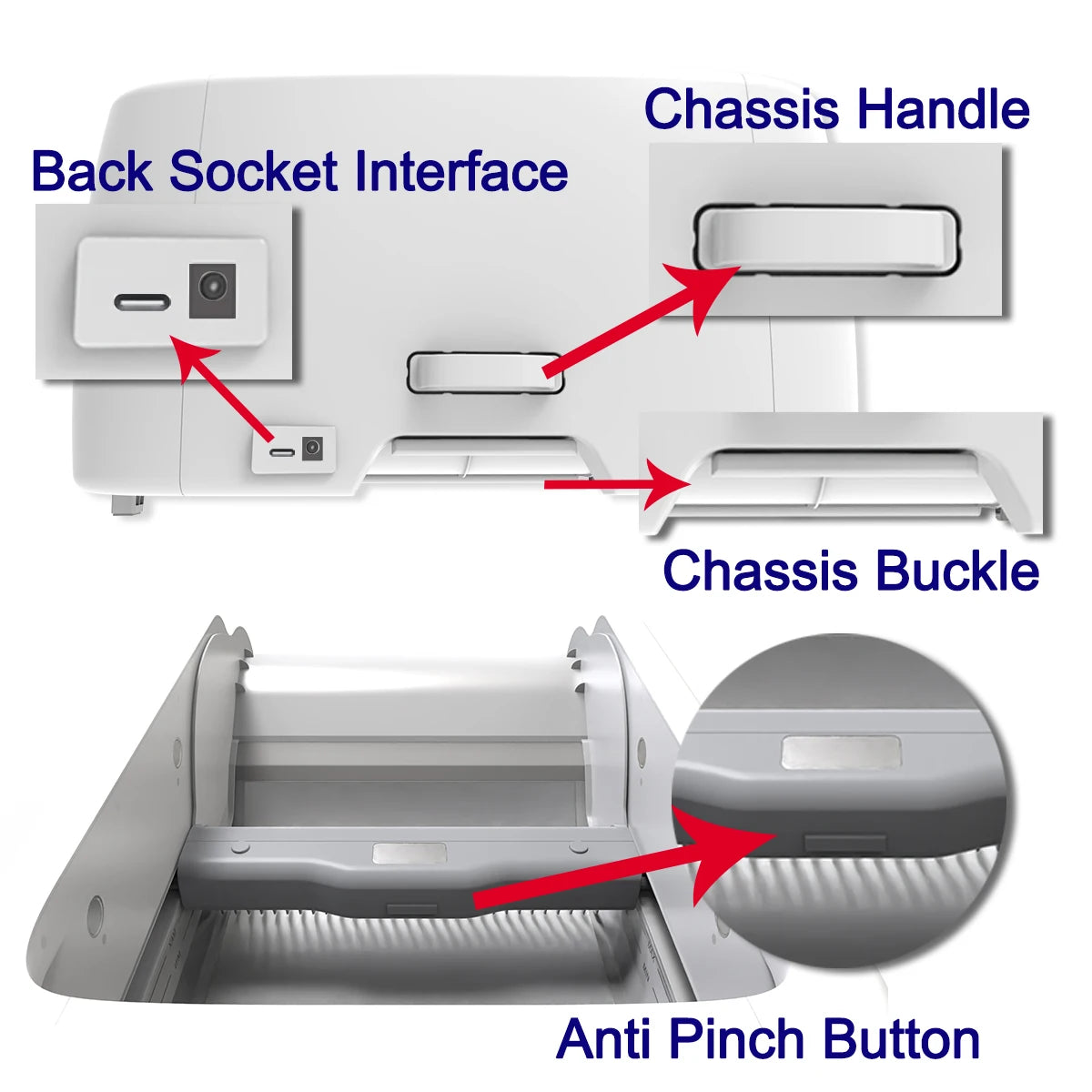 Warm Tips: I designed two power jacks at the back of the cat litter box. We have configured a power adapter for this machine. There are power adapters of different country specifications to choose from. If there is no power adapter suitable for your country, it doesn’t matter, because we are equipped with a TYPE-C interface. You only need to prepare a 5V 1A adapter or a power bank to work. If you encounter unstable voltage, switch to the TYPE-C interface first. It is more stable and more convenient to carry, because it can be run outdoors using a power bank or car charger.